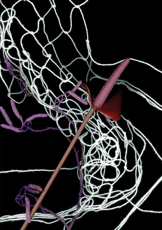 This recognition of the hybrid as well as the development of colonial cultures and history is the theme of T. Lauw in Dark pairing (i) by interweaving plants in a fine-meshed network. Images of cultural inscription and overlay arise precisely from the impossibility of unraveling the materials. The net is no longer just a symbol of capture, but becomes the carrier of the other. At the same time, it is precisely through this function of the wing that it maintains its dominant position: the network not only determines the formation and arrangement of the individual flowers, it also decides what is in front and behind, an outside and an inside: it becomes a border location. In dark pairing (ii) this obvious upper hand disappears in favor of a fine interweaving of the materials. Instead of wire, we are now dealing with knotted yarn, which forms a common network with the plants. Despite the poetic-visual language, the brutality of colonial rule becomes the red line of T. Lauw's works. By using exotic plants, the striving for rule by colonial powers over indigenous cultures is critically examined. The fascination of the exotic has a long history and developed from an extremely hierarchical understanding of the "foreign" of other continents. Collecting “exotic” plants was part of the process of colonization and can be interpreted as an act of cultural appropriation (of the exotic). By building up the works, T. Lauw formulates the appropriation and imposition of the cultural as a processual development, the traces and memories of which form identities to this day and beyond.